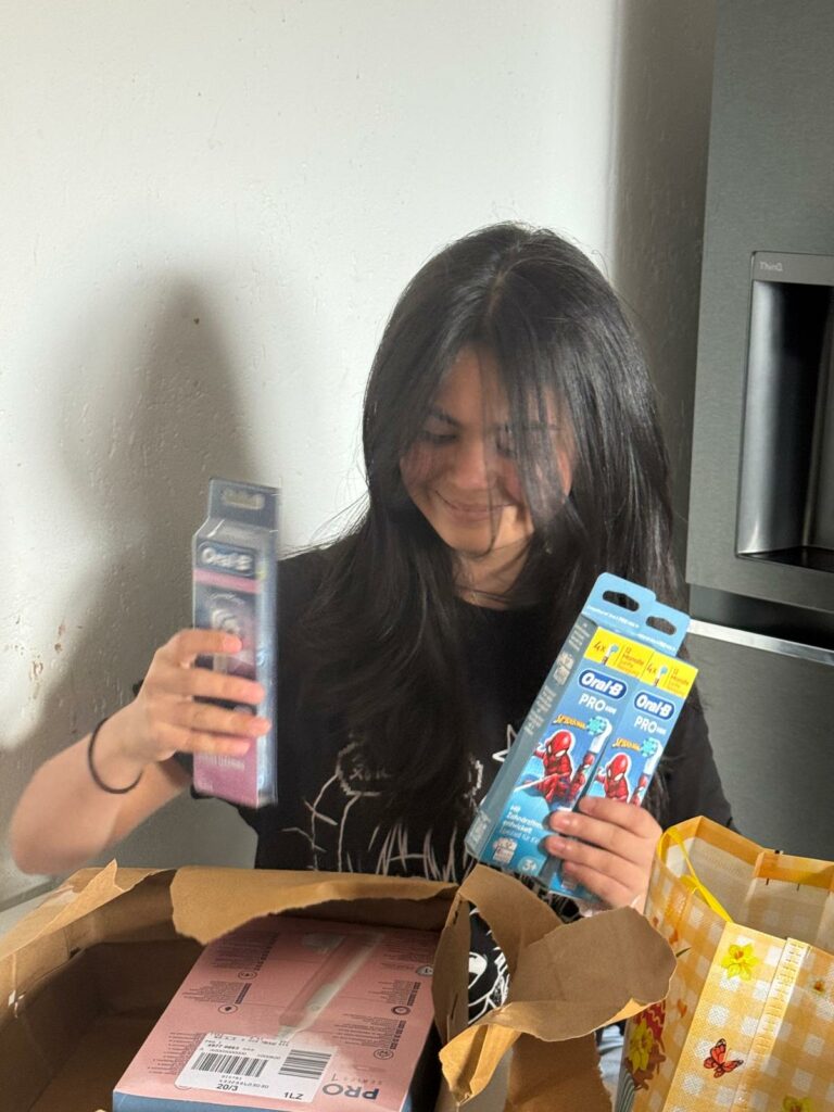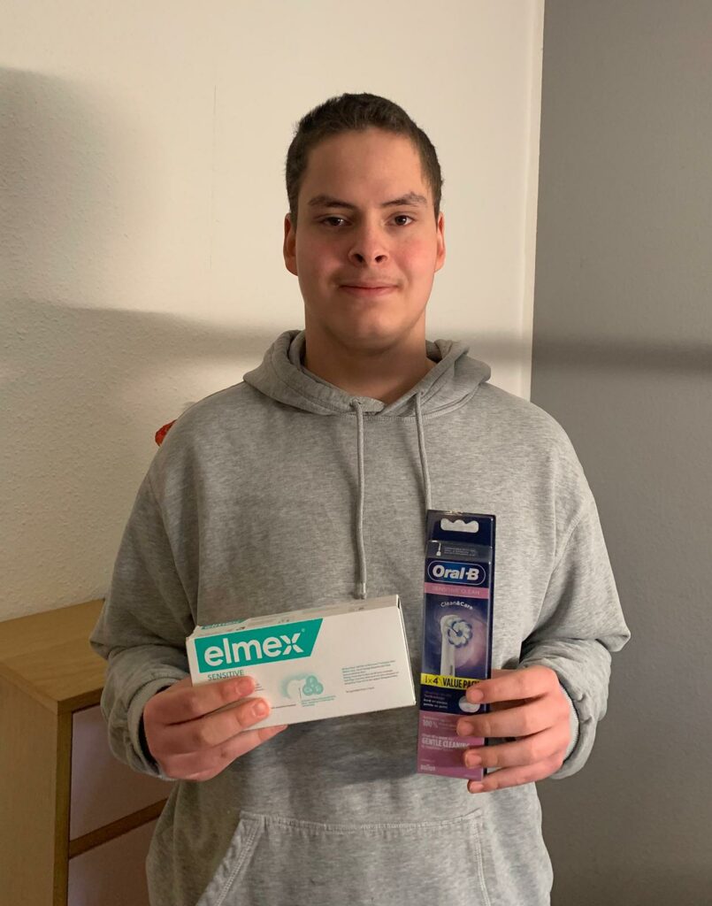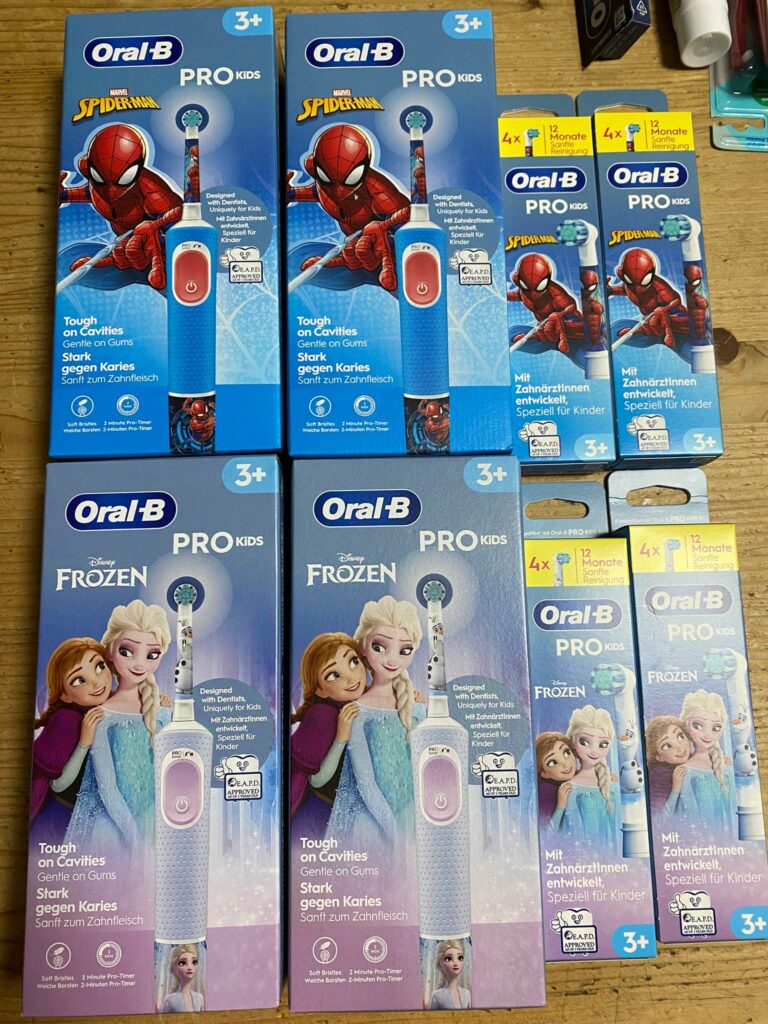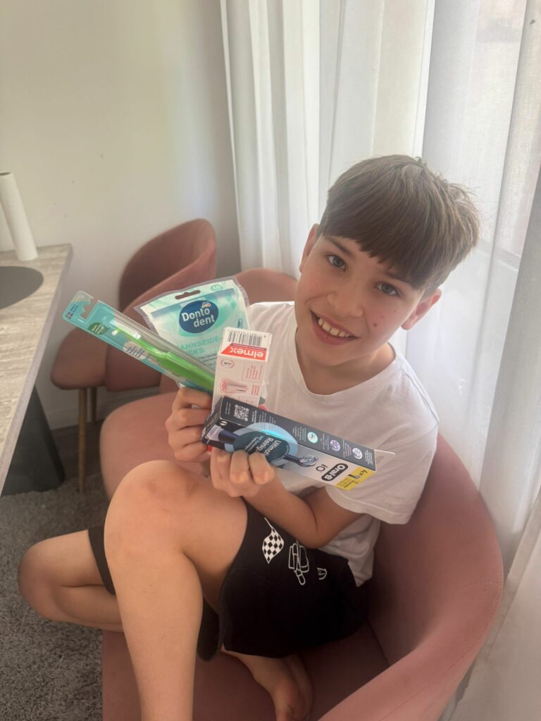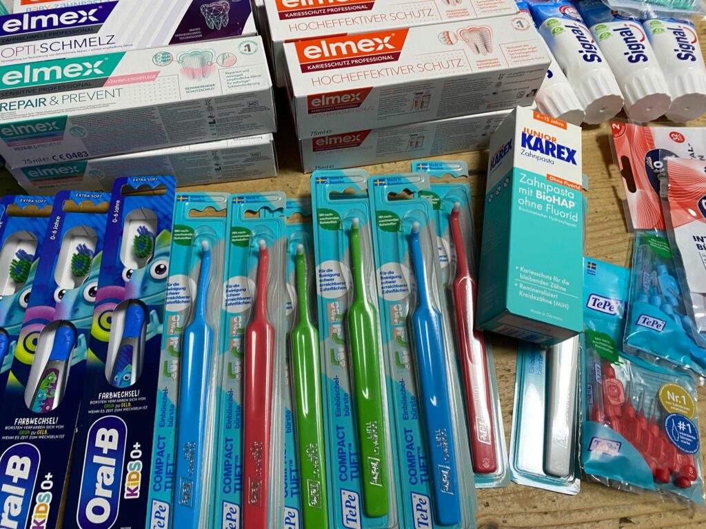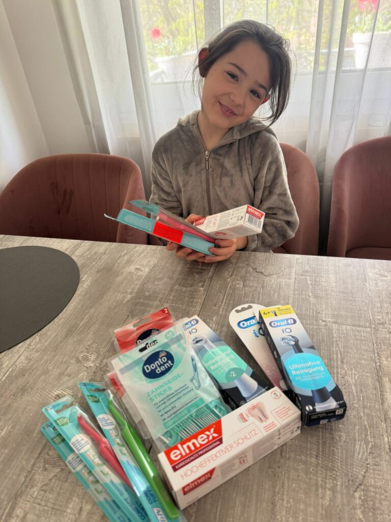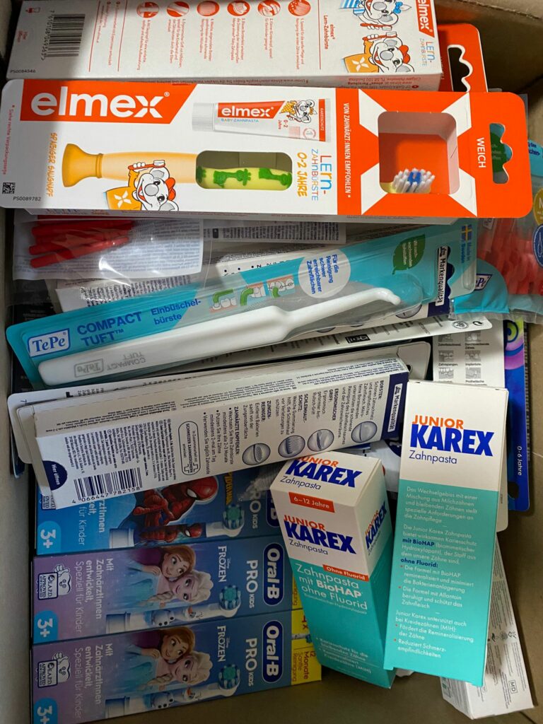 Unsere Kinder bekamen elektr. Zahnbürsten und die passenden Aufsätze für 1 Jahr. Altersgerechte Zahnpasta und Zwischenraum-bürstchen.